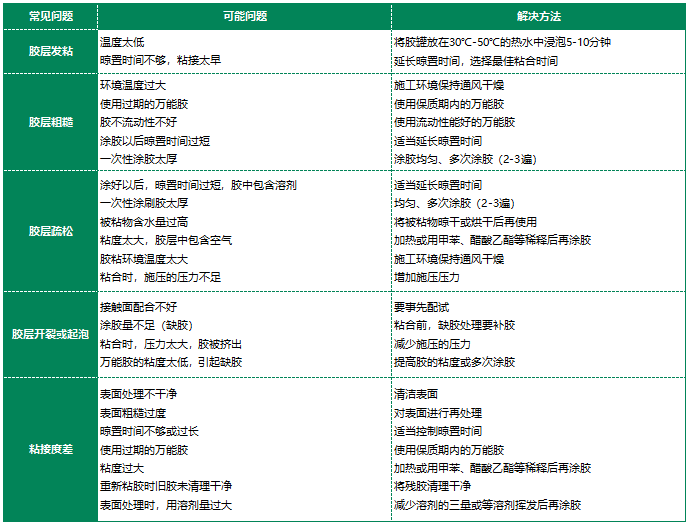 根據(jù)不同粘接需求采用刷涂法、刀刮法、滾涂法、絲網(wǎng)印膠法等,將膠水均勻得涂敷在被貼合物表面,待膠膜指觸干爽(即手指離開(kāi)膠面時(shí)無(wú)膠絲帶起)即可粘結(jié),通常粘結(jié)時(shí)間為15分鐘,最佳粘結(jié)時(shí)間為20~30分鐘(視施工溫度濕度而定),粘結(jié)后適當(dāng)加壓效果更佳!
